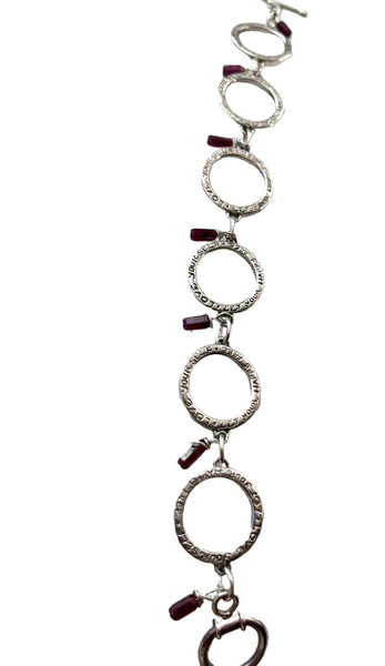 Medium sized 7.5 bracelet with hand-wrapped 4mm rectangular garnet with a cascade of circles of the handwritten lyrics from CG's original song, " Love Your Self Let Your Happy Free; from CG's album, Golden Thread.