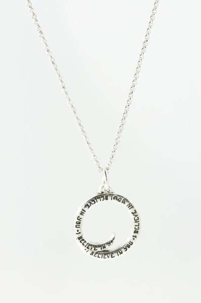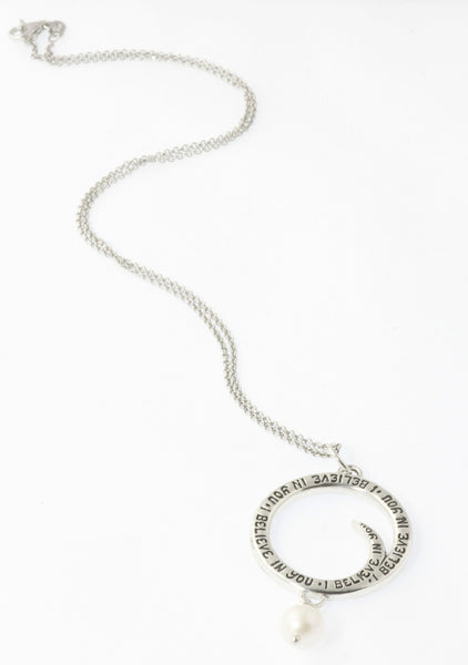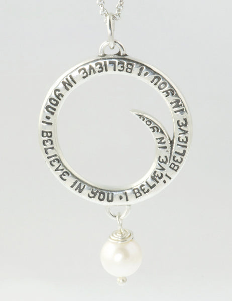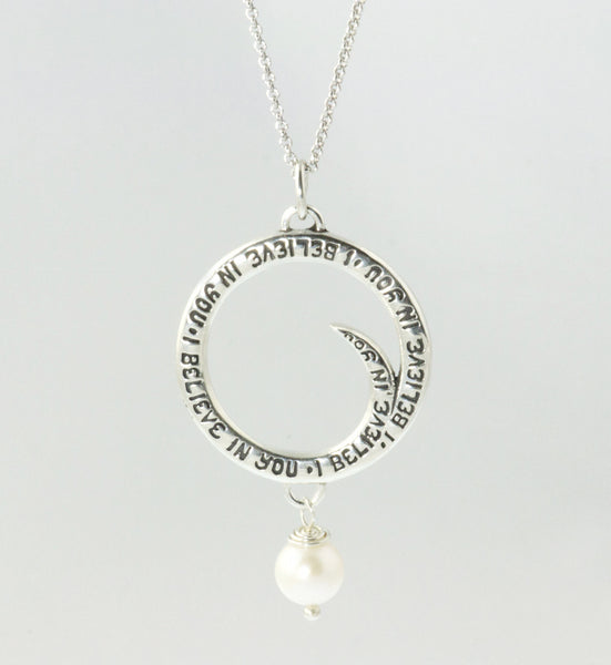 "I Believe In You" is a handwritten message by Christie Grace inspired from her song from her third album "Golden Thread" written for her daughter. The 1" diameter sterling silver charm hangs on a sterling 18" chain with a 6mm white freshwater pearl. Listen to the song "I Believe in You" here: https://christiegrace.bandcamp.com/track/i-believe-in-you