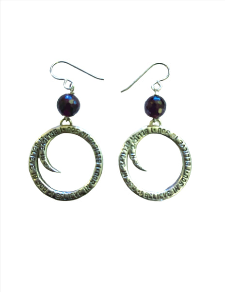 1" Round Spiral Sterling Silver Circle charms with handwritten " I Believe in You" with 8mm facetted Garnet ball accents.