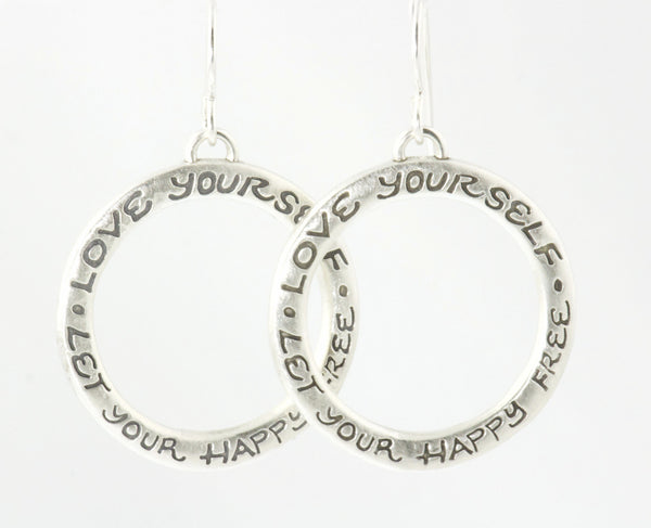 Two 3/4 " round matte sterling silver circles engraved with "Love Yourself ~ Let your Happy Free" on Sterling Silver shepherd hooks.