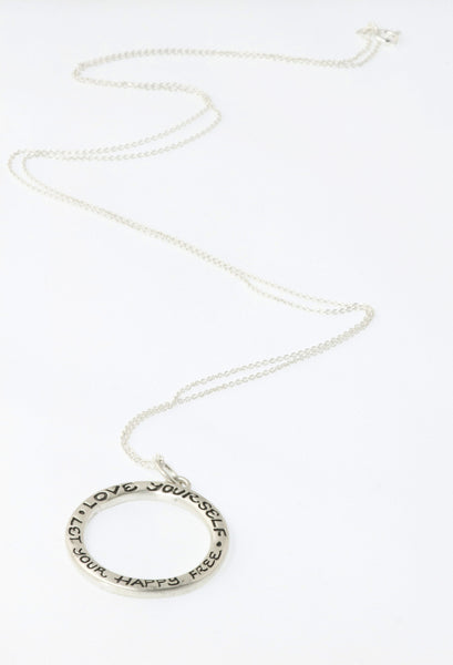 A 3/4 " round matte sterling silver circle suspended on a 16" sterling silver chain with "Love Yourself ~ Let your Happy Free".